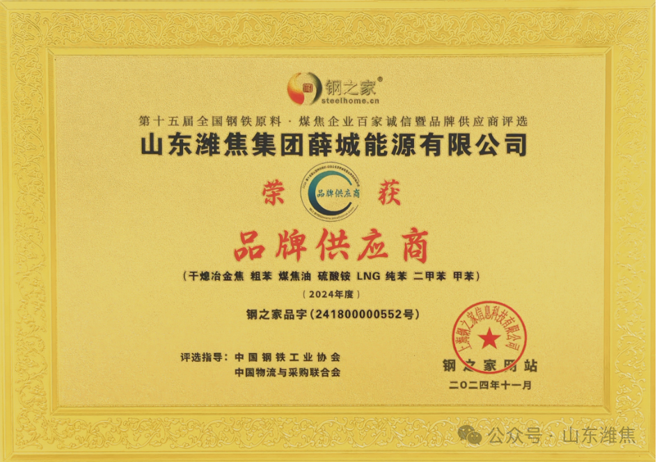 近日,“鋼之家第十五屆全國鋼鐵原料·煤焦企業(yè)百家誠信暨品牌供應(yīng)商”評(píng)選活動(dòng)順利舉行,經(jīng)鋼之家網(wǎng)站征信取證,中國鋼鐵工業(yè)協(xié)會(huì)及中國物流與采購聯(lián)合會(huì)專家評(píng)審,薛城能源公司被評(píng)為2024年度“品牌供應(yīng)商”殊榮。